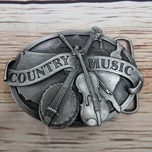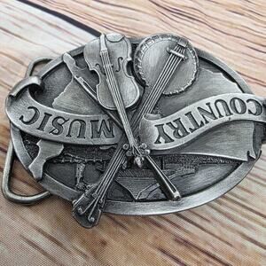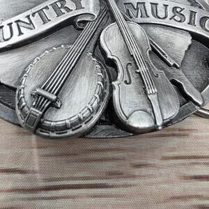 Solid pewter tone cast metal belt buckle featuring a detailed relief design showcasing a banjo, fiddle, and crossed bows, with the text 'Country Music' in bold across a ribbon banner. Background includes classic country scenery such as farm buildings and fencing.