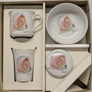 Vintage 1984 Baby's First Gift Set - Bowl, Cup, Tumbler & Pin Box - Brand new in the original box from 1984, Box does show some wear, as it has been stored for quite some time. Items inside are in mint condition. This set was made by Roman and features the artwork of renowned children's artist, Frances Hook. The set contains a child-sized cereal bowl, cup with handle, tumbler without handle and a round "pin box" with lid (trinket box). Each piece is a mix of white porcelain & ceramic, has a gold rim, and an inscription under each picture reads "God sent you the best he had" with the signature of the artist.