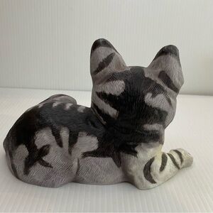 This vintage Enesco Purebred Pets figurine features a small, multicolor tabby cat with green eyes. Made of resin, the sculpture stands 5 inches tall and is 8 inches long. It was created by Kathy Wise in 1984 and is a great addition for any cat lover's collection. One flea bite size paint chip shown in picture, otherwise in great pre-owned vintage condition.