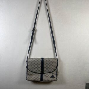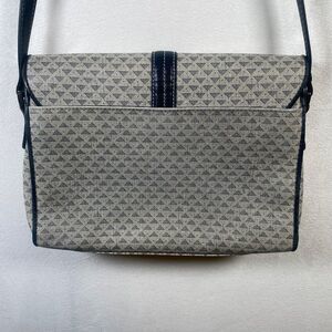 Brand: Liz ClaiborneYear: 1984 (as marked on interior label)Made in: KoreaMaterial: Coated canvas with genuine leather trimColor: Taupe with navy blue geometric triangle pattern and navy leather accentsDetails:Classic 1980s Liz Claiborne monogram-style crossbody bagFlap front with magnetic closureAdjustable buckle strap (approx. 20” drop)Interior zip pocketLiz Claiborne triangle logo on front cornerMeasures approximately 10” wide x 8” tallCondition:Good vintage condition with mild wear on corner piping and light scuffing consistent with age (see photos). Interior clean with light signs of use; zipper functions properly.