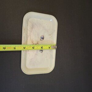 This vintage rectangular tray from 1984 features a captivating cat face design. Crafted by Marlex International, it serves as a unique decorative piece.