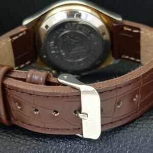 This watch has a stainless steel case in great condition with almost no flaws. The face features Gold accents on a Black Face giving an awesome vintage look overall. It also has a date function!