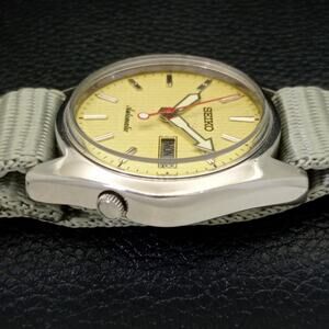 This watch has a stainless steel case in great condition with almost no flaws. The face features Silver accents on a Green Face giving an awesome vintage look overall. It also has a date function!