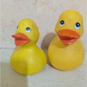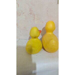 A nostalgic pair of vintage 1984 Shelcore rubber ducks designed for play or display. Features a small squeaker duck and accompanying large duck.