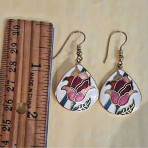 #Vintage 1984 Signed 'SG' #Cloisonne Dangle Earrings Tulip Floral 1.75" long.