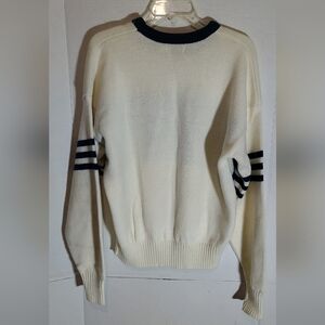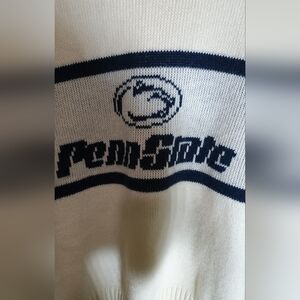 Cozy cream sweater with navy Penn State logo and stripes. Perfect for casual wear. This sweater is a wool blend and size large.