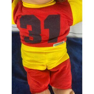 A charming vintage Cabbage Patch Kids doll featuring a vibrant red and yellow outfit with the number 31. It has brown yarn hair and is 16 inches tall.
