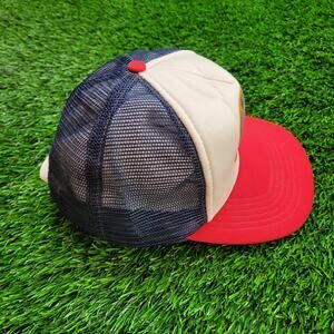RETRO BASEBALL STYLE, CLASSIC AMERICANA LOOK, COLLECTIBLE SPORTS PIECE, RED WHITE BLUE MESH, OLD SCHOOL TEAM FASHION, NOSTALGIC, ICONIC, VINTAGE, RETRO, FANWEAR