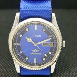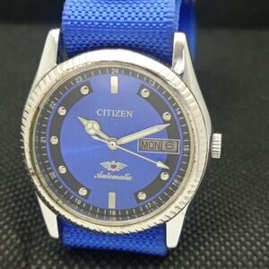 Vintage 1985 Citizen Automatic Mens Silver Watch W/daydate & Blue accents