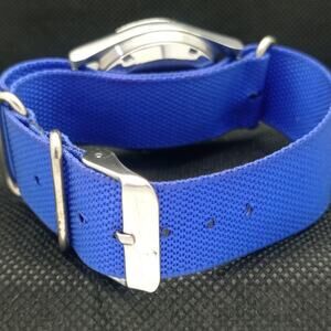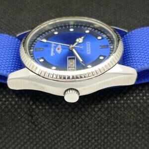 Stainless Steel Case in great condition and almost no flaws. The face features Silver accents on Blue Face giving an awesome vintage look overall. It also has a date function!