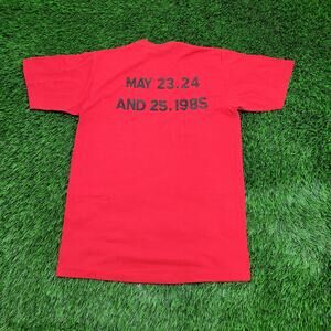 Rare 1985 Grease musical shirt in red Jerzees cotton poly blend, features bold black logo and show dates.