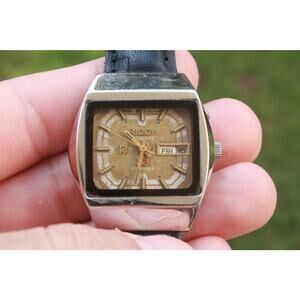 This watch has a stainless steel case in great condition with almost no flaws. The face features Gold accents on a Gold Face giving an awesome vintage look overall. It also has a date function!