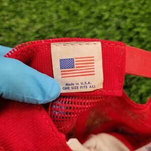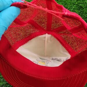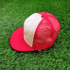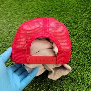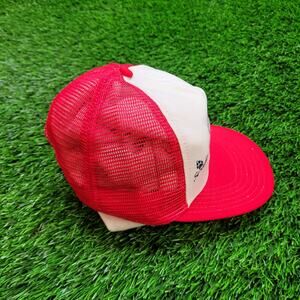 Vintage 1985 Bud Light Spuds MacKenzie trucker hat snapback red and white mesh cap made in USA featuring the classic Anheuser-Busch party dog beer advertising graphic