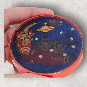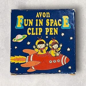 Blast off into pure 1980s nostalgia with this vintage 1986 Avon Fun in Space clip pen. Featuring a colorful lenticular space scene with two space suited kids riding a rocket ship the pen even retracts into the housing when not in use. This playful novelty pen was made in Japan exclusively for Avon and is still in working condition.