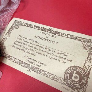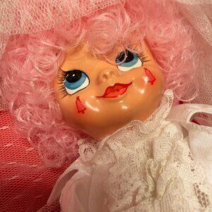 DETAILS: With her cotton-candy pink curls, wide blue eyes, and satiny bridal gown trimmed with lace, she’s equal parts kitschy charm and nostalgic treasure. Comes complete with her original hang tags, veil, bouquet, box, and certificate of authenticity.