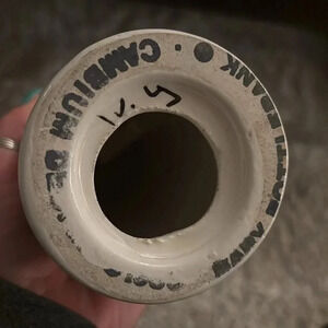 This vintage Cambium Designs ceramic baby bottle bank is a unique addition to any collection. Made in the USA in 1986, it stands at 13 3/4 inches tall and is 3-1/4 inches wide, with a vibrant blue color and an original plug. The bank is branded with CAMBIUM DESIGNS and is an original piece, not a reproduction.
