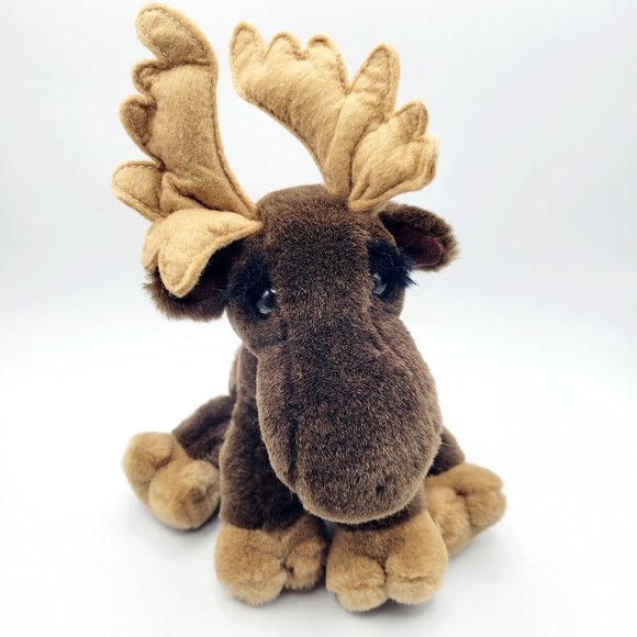 This vintage, 1986 Dakin piece is a brown, moose plush toy or stuffed animal with tan hooves, black, fluffy eyebrows, and tan, felt antlers.