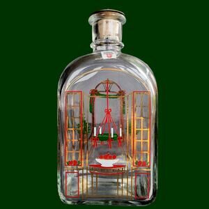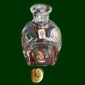 Lovely clear glass square "Juleflask" with round shoulders, short neck and cork and brass stopper designed by Michael Bang and Jette Fröhlich for Holmegaard Denmark and produced in 1986. It features a beautiful printed design of a Christmas appointed home, starting with the exterior steps on the front and continuing inside the home to the entry that is printed on the back side for a cool dimensional effect. This Juleflask also has numbers down the side as an Advent calendar to drink a dram every night until Jule. Great condition, original sticker, design and stopper intact. Measurements in photos.