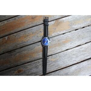 This watch has a stainless steel case in great condition with almost no flaws. The face features Mickey mouse accents on a Blue Face giving an awesome vintage look overall.