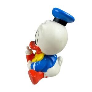 Add a nostalgic touch to your Disney collection with this 1986 Shelcore Baby Donald Duck soft vinyl figure. Featuring an adorable design of Donald Duck as a baby, dressed in his classic sailor outfit while holding a baby bottle, this figure is a charming vintage piece.
