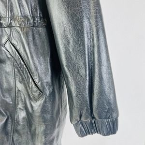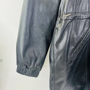 This vintage leather jacket from Wilsons is a timeless piece that features a quilted design with a mid-length parka style. The jacket has a relaxed fit and comes with a cinch waist to give you a comfortable and stylish look. It has a full zip closure and tie, making it suitable for both formal and casual occasions. The jacket is lined and hooded to protect you from the cold weather. It is available in XL size and black color, making it a perfect addition to your wardrobe. The jacket is made of polyester insulation material, and it is not handmade. This jacket is a must-have for any fashion-forward person who wants to add a touch of vintage style to their clothing collection.