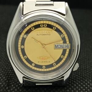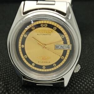 This watch has a stainless steel Case in great condition and almost no flaws. The face features Gold accents on a Black Face giving an awesome vintage look overall. It also has a date function!
