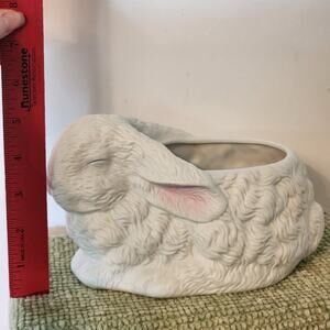 Adorable vintage 1987 FTDA ceramic bunny planter made in Taiwan. Features a peaceful sleeping rabbit design with a textured white fur finish and soft pink inner ears.