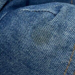 He is wearing a pair of distressed overalls. Only condition issue is a stain on the front right leg of the overalls that is yellow. Non smoking home. See pictures for condition details.