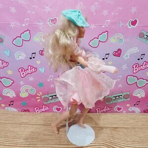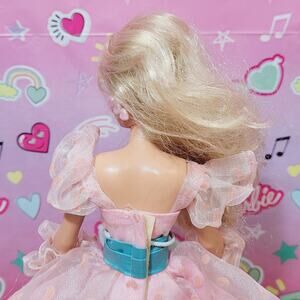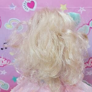 From 1987, we have the Hasbro "Perfect Prom" Maxie doll wearing her original dress, gloves, earrings, and hair bow. She has two flaws that I noted: there is a small piece of tulle on the front of her dress that has come loose from the belt; and there is a pink mark on the back of one leg. Her knees bend and hold as they should. Overall she is a beautiful doll that will display well in your doll collection.
