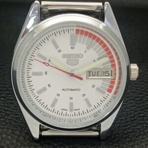 This watch has a stainless steel case in great condition with almost no flaws. The face features Red accents on a White Face giving an awesome vintage look overall. It also has a date function!