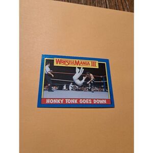 Vintage 1987 Topps WWF WrestleMania III trading card No. 52 “Honky Tonk Goes Down” featuring Jake “The Snake” Roberts tossing The Honky Tonk Man to the canvas. Officially printed in the USA by Topps Chewing Gum Inc. and Titan Sports Inc. Card front shows WrestleMania III logo in red and yellow, title in red and white, and live in-ring action photography credited to Steven Tyler. This is an authentic vintage raw, circulated, ungraded card. Please note I am not a professional trading card dealer—exact card pictured is the exact card you will receive. A great addition for any WWF wrestling memorabilia or trading card collector.