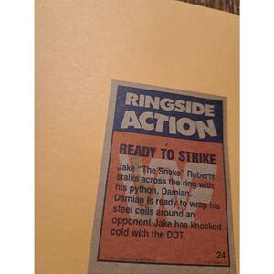 Vintage 1987 WWF Ringside Action trading card featuring Jake “The Snake” Roberts and his python Damien. Captioned “Ready to Strike,” this card shows Jake standing in the ring holding his snake, moments before a fierce match. Printed in the USA by Topps Chewing Gum Inc. and Titan Sports Inc. Card number 24. Card is ungraded and sold as shown — please note, I am not a professional trading card grader. You will receive the exact card pictured. Good vintage condition with typical age-related surface wear.