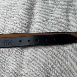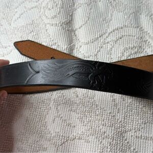 Stylish black leather belt featuring a striking eagle buckle with blue accents. Perfect for adding a bold touch to any outfit.