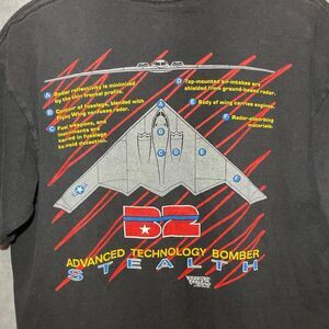 Vintage 1988 Bomber Stealth single stitch black tee. No size visible. Measurements listed below. Small flaws pictured. The paint stain is on the inside near the hem and is not visible when worn. The small bleach stain is on the back.