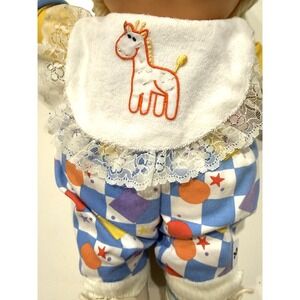 Vintage 1988 soft-bodied doll with vinyl head, bright blue eyes, and blonde yarn hair.