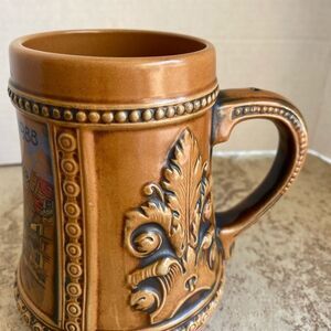 This vintage 1988 Gerz beer stein is a timeless piece of German craftsmanship, made in West Germany during the final years before reunification. Crafted from high-quality ceramic with a detailed relief design, this lidded-style cana (without lid) is still a beautiful and collectible item.