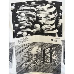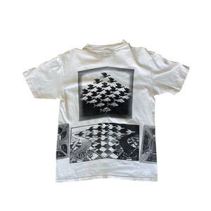 Rare true vintage M.C. Escher 1988 T-shirt, featuring surrealist artwork licensed through the Escher estate and printed by McGill. Printed on a classic Stedman Super Hi-Cru Made in USA blank. Crisp black-and-white graphic with multiple Escher designs on front and back. A must-have for collectors of surrealist art, vintage graphic tees, and wearable museum pieces.