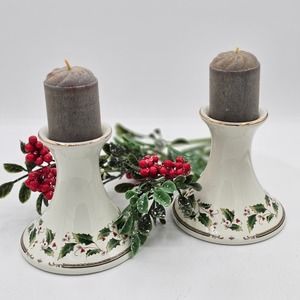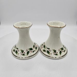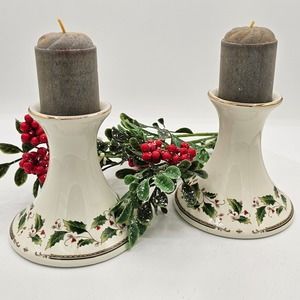 Vintage 1988 Royal Limited Holly Holiday Porcelain Candlestick Holders Set of 2. Measures 3.75" tall. Beautiful Holly Leaf and Berry Design. Candles and floral not included. No chips or cracks.