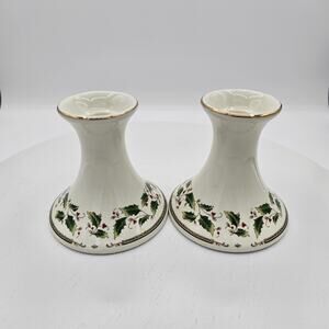 Vintage 1988 Royal Limited Holly Holiday Porcelain Candlestick Holders Set of 2. Measures 3.75" tall. Beautiful Holly Leaf and Berry Design. Candles and floral not included. No chips or cracks.