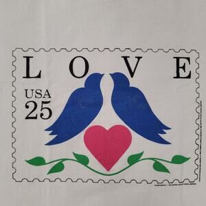 Celebrate timeless romance with this 1988 USPS Love Stamp tee featuring blue doves and heart print. Rare find made in USA!