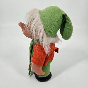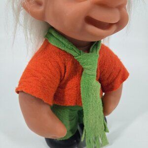 This vintage, 1989, piece by Dam, is a large size boy troll with round ears, white hair, large amber eyes, black shoes, and orange and green felt clothes (a shirt, pants, and scarf). Such an adorable, nostalgic piece for anyone's collection!