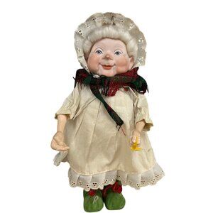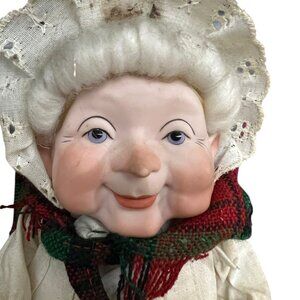 This charming 1989 Mrs. Claus porcelain doll, crafted by Department 56, adds festive elegance to holiday decor. With intricate details from her lace bonnet to her plaid scarf, she embodies the warmth of the season. Ideal for collectors or as a decorative piece, she brings nostalgic holiday cheer.