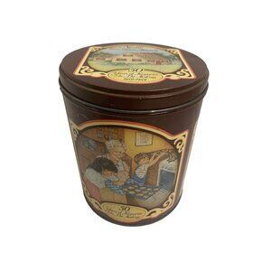 Celebrate baking history with this vintage 1989 Nestle Toll House Morsels 50th Anniversary tin canister. Featuring nostalgic artwork of the iconic Toll House Inn and family cookie traditions, this collectible tin is perfect for kitchen storage or retro Americana décor. Durable metal construction with lid. Great gift for cookie lovers and vintage kitchen collectors.