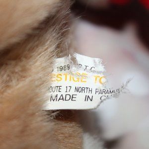 This vintage 1989 Prestige Toy Corp plush teddy bear is a must-have for any collector or fan of plush bears. With a length of 10 inches, the bear is made of soft polyester material and features a tan color. It is surface washable and in its original form, without packaging. The bear is in good condition and would make a great addition to any collection. The bear is perfect for Christmas and features a cute, laid-back appearance, as it is shown lying on its belly. The bear is not signed or antique, but it is an original, licensed reproduction. It was manufactured in China during the 1980s and is suitable for anyone looking for a unique and cuddly addition to their collection.