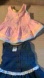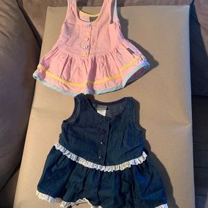 We are in the process of a retirement move and we have tons of vintage items we had in storage. These dresses were part of my daughter's wardrobe when she was a baby. They are both Jordache Jumper style dresses. The pink dress is cotton and polyester but has a soft corduroy feel. It has adorable little plastic colored buttons. The blue dress is cotton and has a soft denim look and feel. It has white lace around the mid section and hem and a tie in the back.