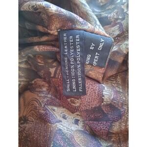The product is a vintage 1990 J Walden Southwest print jacket in size XL. Made of leather with a synthetic insulation material and polyester lining, this bomber jacket features shoulder pads and is styled after motorcycle and biker themes. The tan color and 80s-inspired design make it a unique and stylish piece for both men and women looking for a retro wardrobe addition.