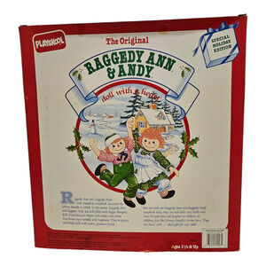 This vintage Playskool doll set features Raggedy Ann and Andy dolls with red hair and black eyes. The dolls are 12 inches tall and made of cloth material with a light complexion. This special holiday edition set includes two pieces and is an original. The dolls are in their original packaging, which has been opened. However, the dolls are still secured to their original backing.