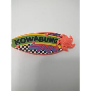 This vibrant surfboard features the word "Kowabunga" in bold letters, making it a fun and eye-catching accessory for any beach day your turtles are having.
