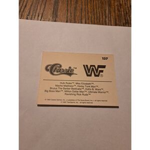 The back of the card displays “Classic WWF 137” along with a printed list of wrestler names from the era. Marked ©1990 Classic Games Inc., a subsidiary of The Scoreboard Inc., and ©1990 Titan Sports Inc., all rights reserved.