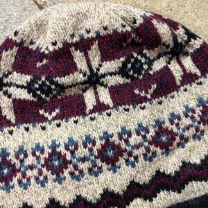 Very cool Fair-Isle knit snow hat from late 80s or early 90s. Wool outer, black fleece lining, fun tassel. Great condition!